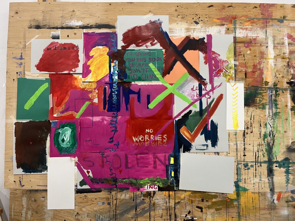 I have explored compositional space. I have explored absence and presence on the page and at large. I have gone through the motions of a process. I have engaged with flow and with experimentation and with not caring what comes out. I have played with intense technical rendering and then free, sloppy, mark-making – and have experimented with putting them both together. Constraint and catharsis. Through this, I’ve inadvertently explored emotional processing and what it looks like through art. I have made according to my value of using whatever you have and whatever is around you, and by doing so, have embraced chance and spontaneity.