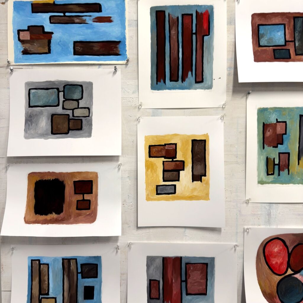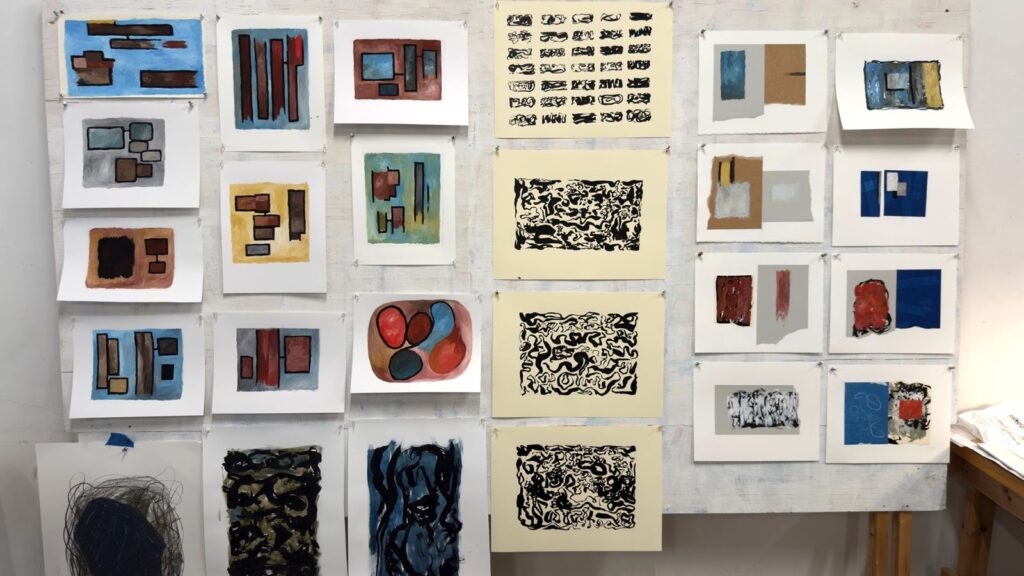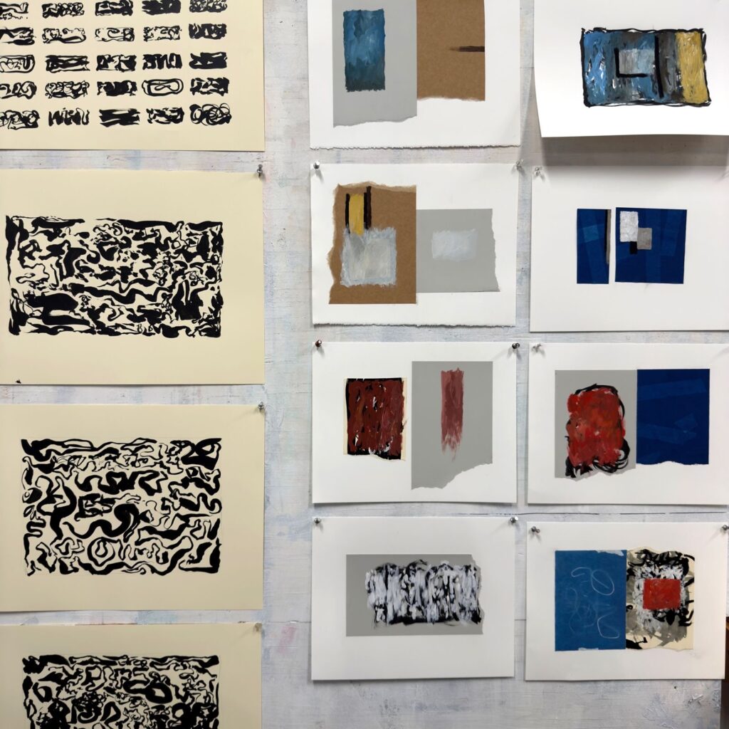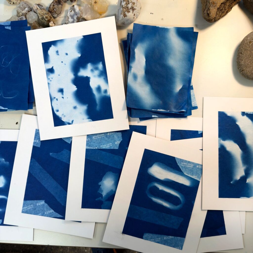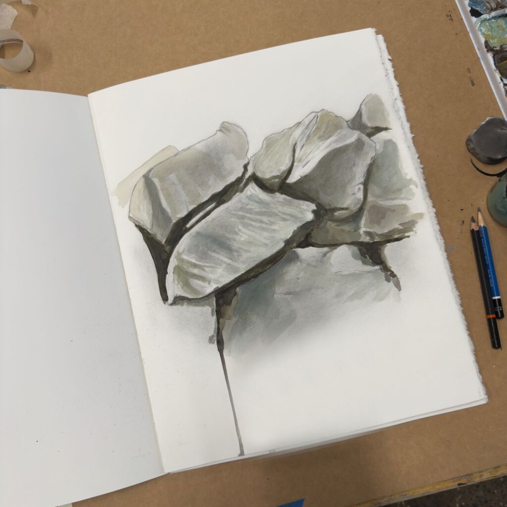 (…) During my time at the Factory I focused on 2D works on paper. This included small paintings and mixed media drawings, and experimented with small cyanotypes, using both natural and man made materials. I couldn’t resist drawing portions of the sea wall and also rediscovered the beauty in kelp leaves. Back home I have been collecting dried kelp and developing sculptural concepts such as seeing them as ‘bones’.(…)