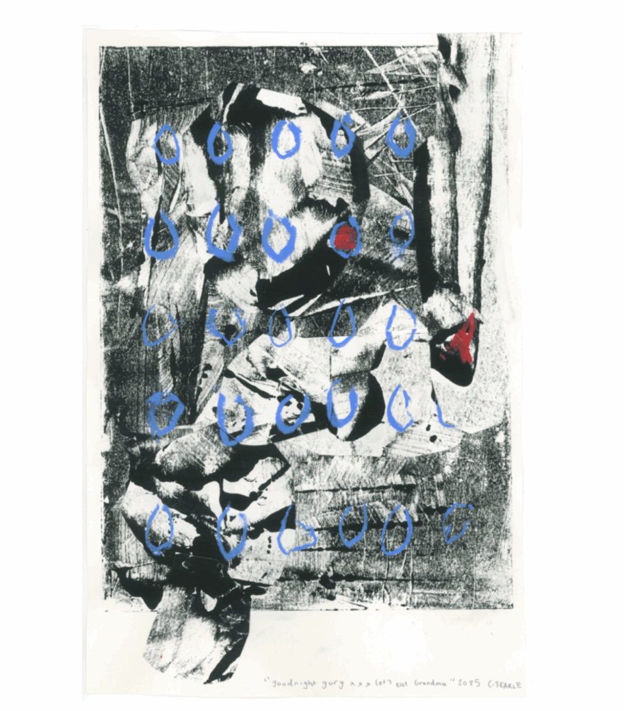 Charlotte Searle is an artist from the UK who explores fictional multiplicities and knotty, entangled themes that resist definitive answers. She plays with concepts of place and non-place, home, mysticism, memory, and desire. By exploiting iteration and automatism, she harnesses the subconscious while inviting an unsettling awkwardness. Charlotte’s practice employs messy, irreverent methods of play, embracing mistakes and humour. Her works aim to consume and regurgitate, revealing imagined spaces in constant flux, where chaos, absurdity, and clarity intertwine—inviting a space for the mind to wander.