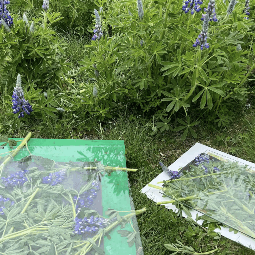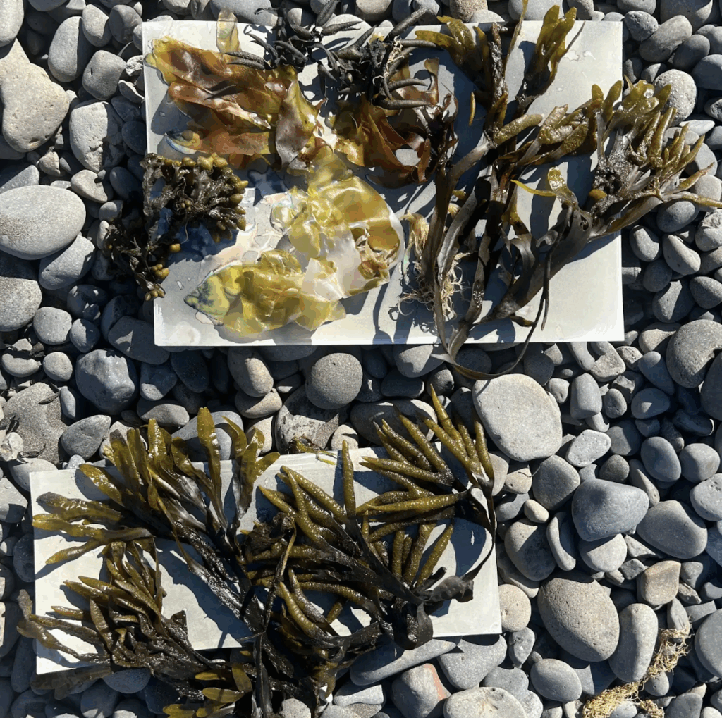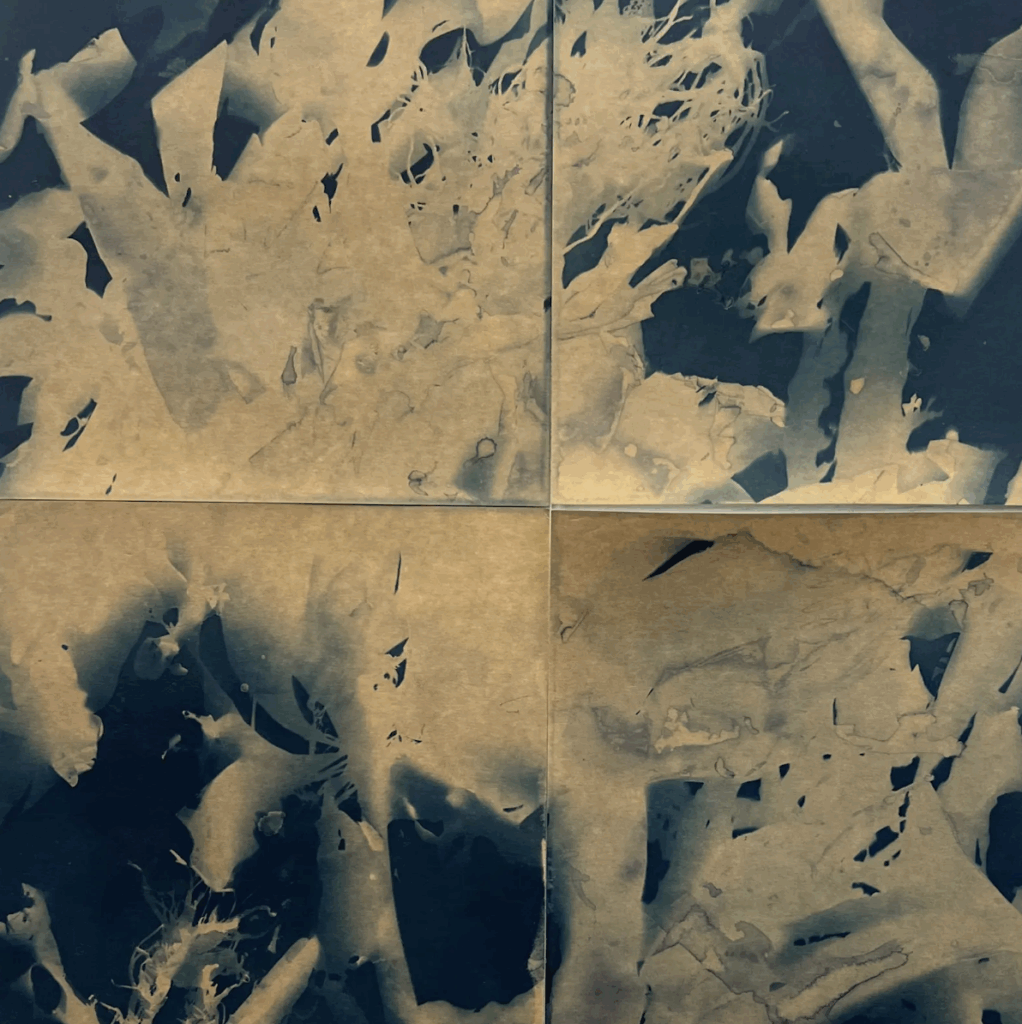 “It is a long journey from Aotearoa to Iceland. I was interested to think about what it means to be a guest or manuhiri in such a place- so far from my home. In my creative practice I often work with minerals and metals and I was keen to find out how it would feel to be in a landscape such as Iceland. How might minerals be thought of as hosts? How might my strategies for working with earthly materials shift in a different location? The earth in Iceland felt very active- earthly forces are very apparent, boulders fall from mountains, volcanoes erupt, the ground shifts and flows. I visited the historic mine site at Helgustadir where the crystal Iceland Spar was mined. This crystal had a unique property – double refraction – and was used in imaging technology. I used the crystal in pinhole cameras, refracting the summer sun and capturing the light on photographic paper. Over the month of May in Stöðvarfjörður, the days grew longer and longer, until there was almost no night darkness. Walking home from the studio at 1am, the birds would be singing. Capturing light became my main activity during my time at the Fish Factory as I worked with seaweed and lupins to make lumen prints and cyanotypes. Light and shadow, air and earth, water and stone.