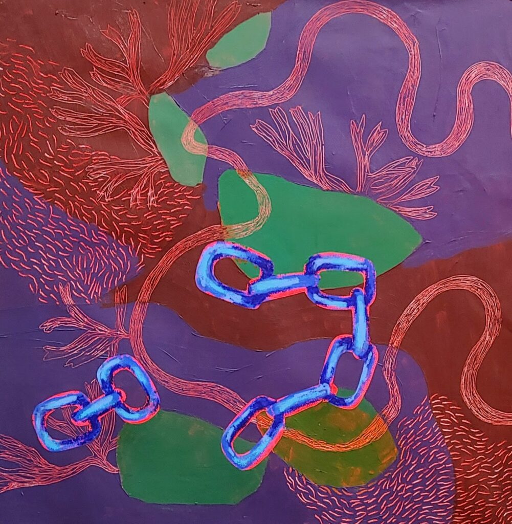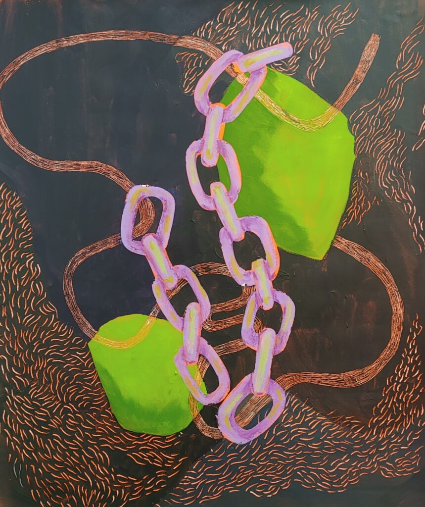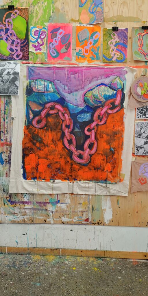 I began by painting a canvas with the theme of chains, which I later transformed into a chainshaped soft sculpture.