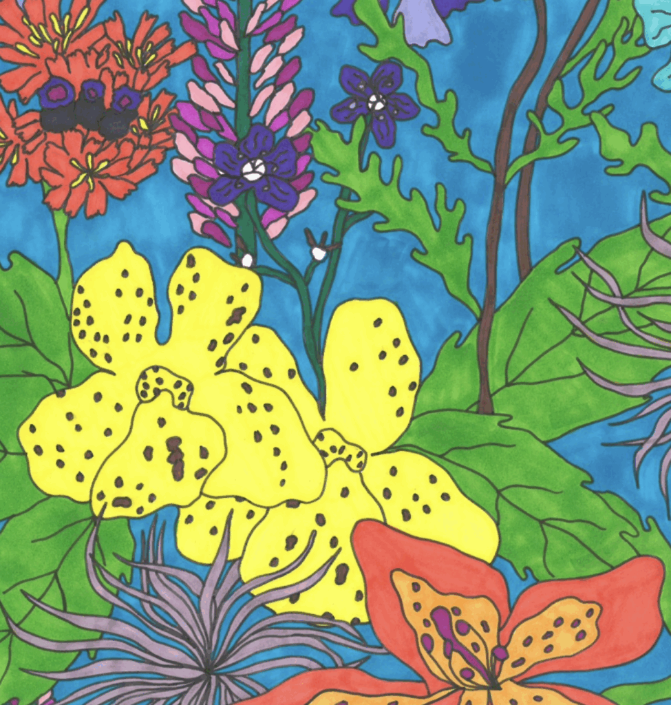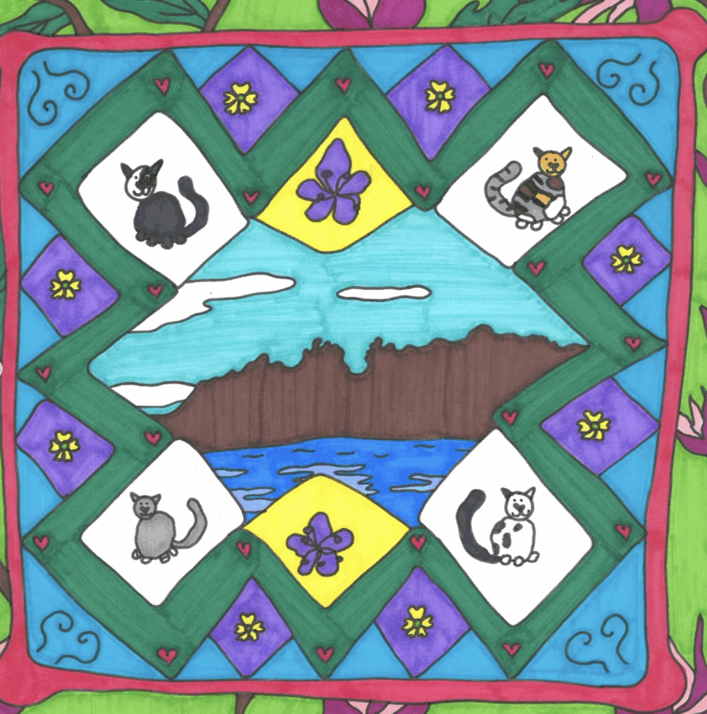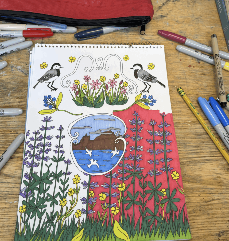 During her residency, she worked on a series of marker illustrations that were inspired by the breathtaking landscapes of Iceland. The flower gardens and fabric collections at Petra’s Stone Museum also heavily influenced her drawings. She spent a lot of time outside taking videos of water, birds, and the iconic sister mountains of Stöðvarfjörður. These were accompanied by recorded bird calls, waves, organ, theremin, and her voice to collage together in her short and sweet video and sound pieces.