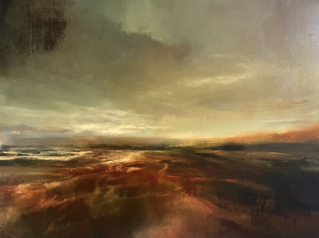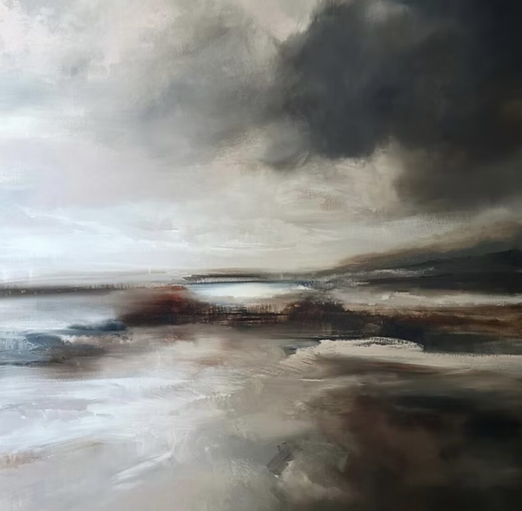 She is fascinated by the alchemy of paint — how emulsion retracts from oil, how acrylic clings on top, how a brush or scraper dipped in white spirit can shift a surface as dramatically as weather reshapes a landscape. This dialogue between material and place underpins her practice, reflecting the instability and richness of the land itself and revealing ‘ghosts’ beneath the painted surface.