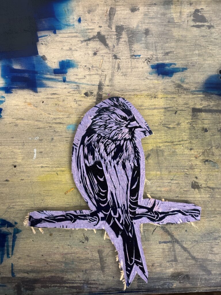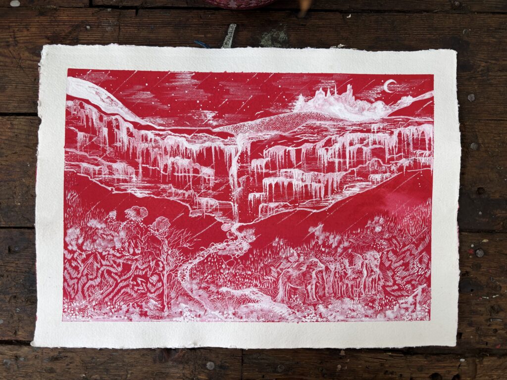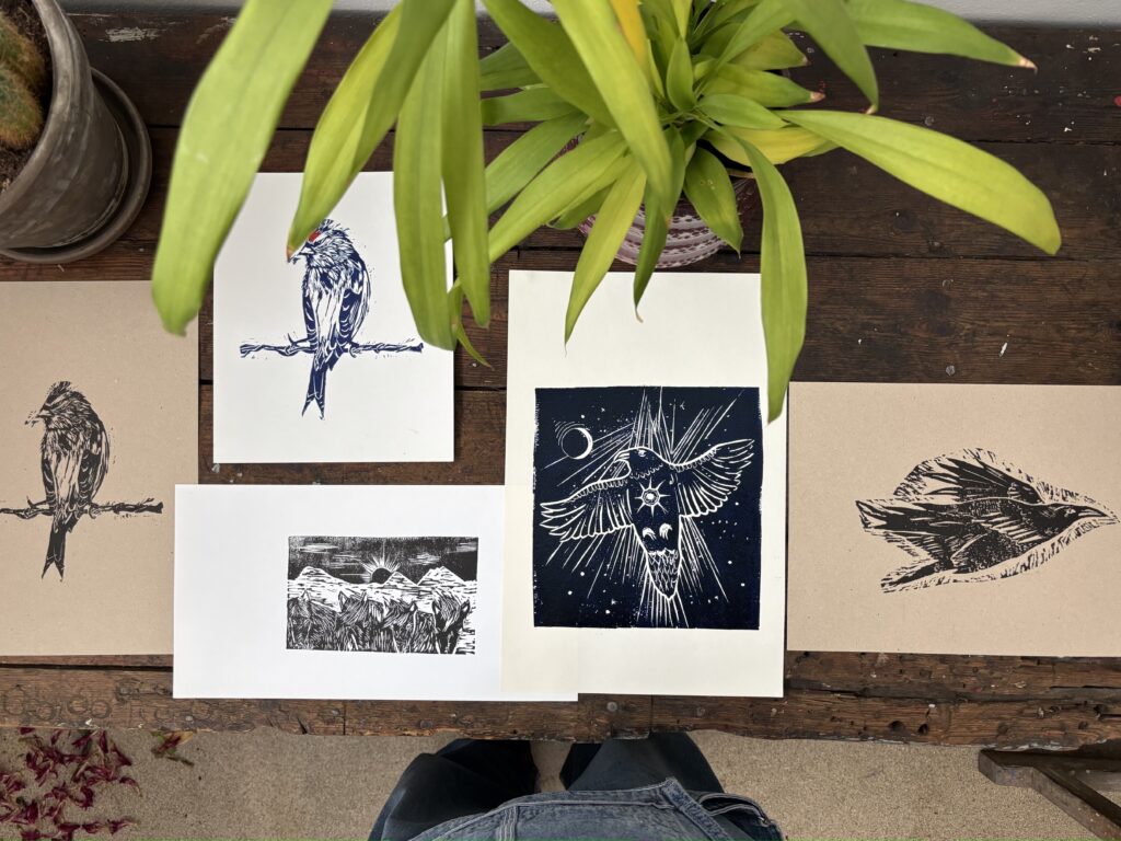 Whilst in Stöðvarfjörður, my practice helped ground me. I would make marks of the beautifully unfamiliar landscape of mountains and ocean, and the blurred snow scape from the minibus window en route to get groceries from Bónus. My writing practice became integral to my image making process and sparked a series of lino prints inspired by my morning alarm of Redpolls, an encounter with a raven and the Icelandic horses whose ears poked the mountain tops.