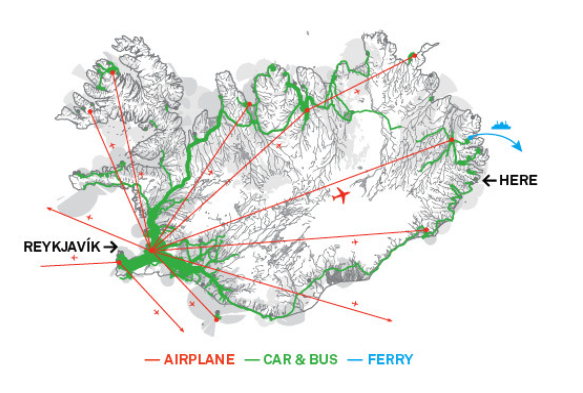 Most residents arrive via Keflavík International Airport, continue to Reykjavík, and then fly domestically to Egilsstaðir.
